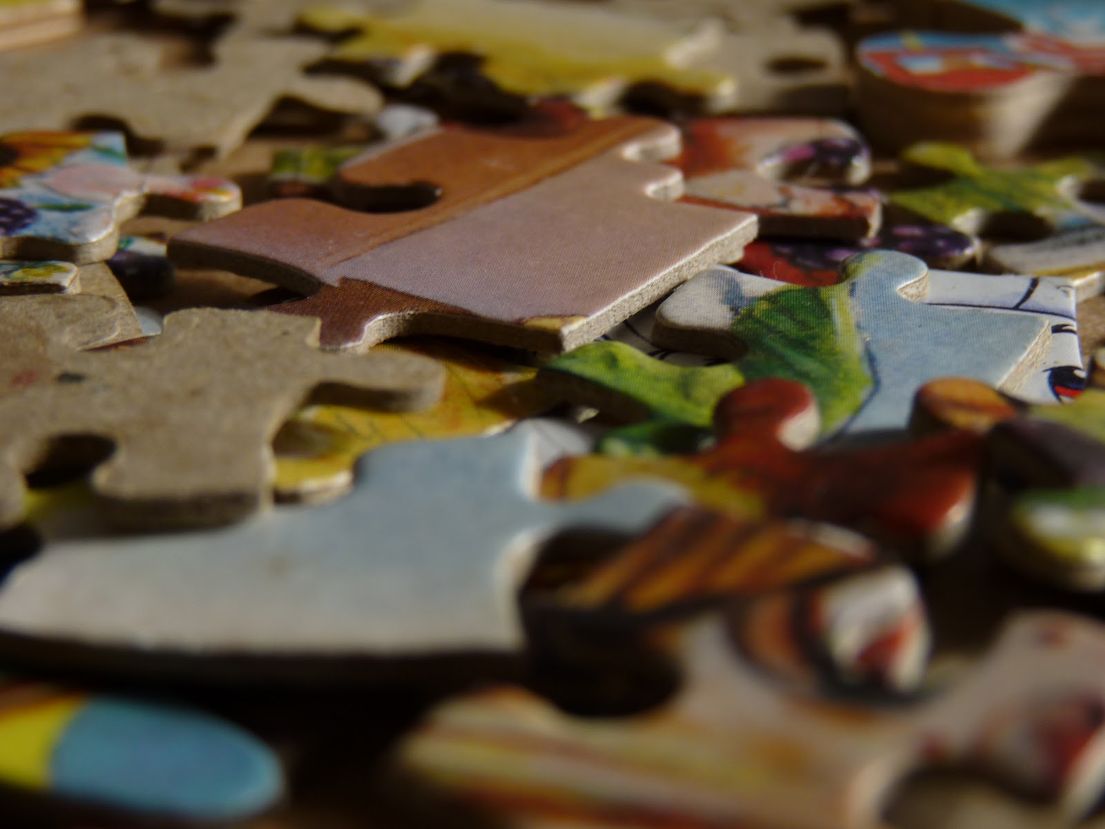 These were just out on the table after a failed attempt at finishing a puzzle, I found it interesting how the light picks out the sides of the pieces and that some of the colours merge together slightly